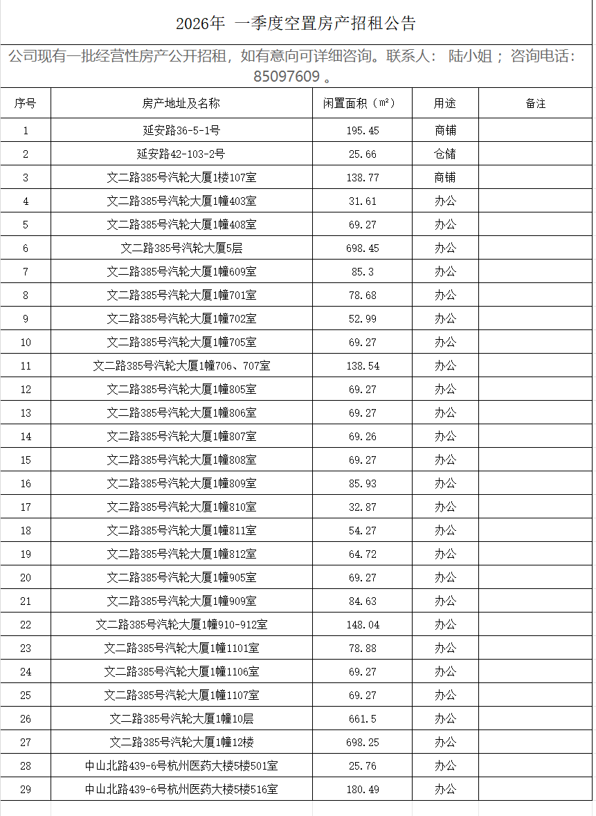2026年 一季度空置房产招租公告